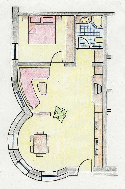 - Wohn- Essraum: komplette Kücheneinrichtung, Geschirr, Kühlschrank mit Gefrierfach, Ceran-Kochfeld, Backofen, Kaffee- und Spülmaschine. Garderobe, Esstisch mit Stühlen, ausziehbare Schlafcouch und SAT-TV.